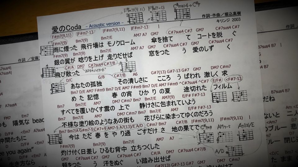 コードが頻繁に変り、指板図も所狭しと書きこみました。